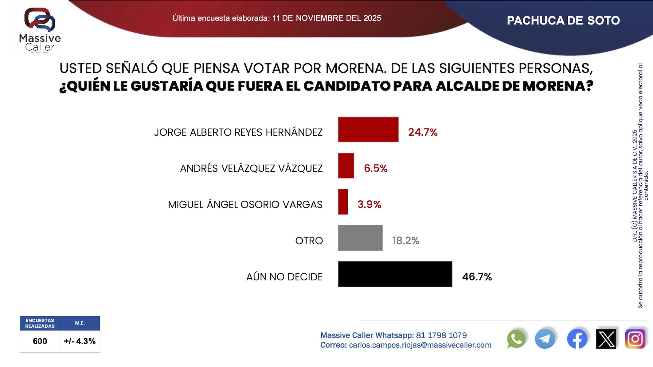 La empresa encuestadora Massive Caller, presentó su estudio de opinión mensual, sobre las preferencias electorales municipales para Pachuca.