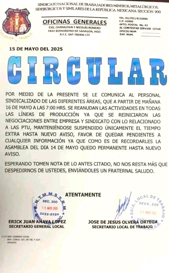A través de una circular, los empleados sindicalizados, se enteraron que a partir de las 7 de la mañana de hoy, se reanudan las labores en todas las líneas de producción en esa empresa.