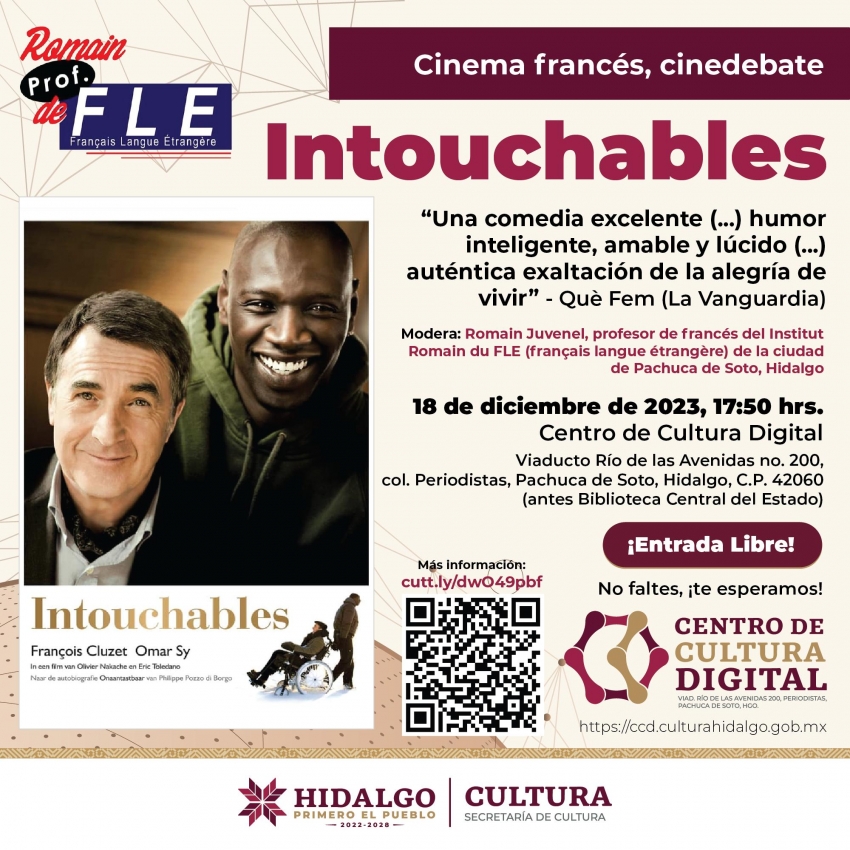 El Centro de Cultura Digital invita a las familias hidalguenses a su ciclo de cine francés gratuito con la proyección de la película Intouchables, este lunes 18 de diciembre, a las 17:50 horas, en sus instalaciones en Río de las Avenidas, número 200, colonia Periodistas.