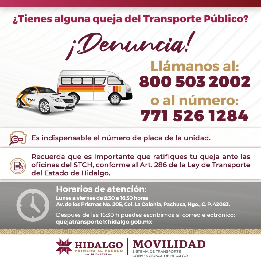 Es indispensable contar con el número de la placa de la unidad que está siendo reportada, así como ratificar la queja ante las oficinas del STCH, conforme al artículo 286 de la Ley de Transporte del Estado de Hidalgo, en un horario de lunes a viernes de 8:30 a 16:30 horas, en Av. de los Prismas No. 205, Col. La Colonia, C.P. 42083 en Pachuca, Hgo.