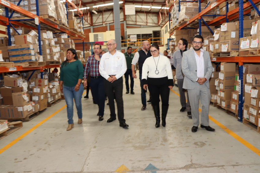 Posteriormente, se realizó un recorrido por el almacén central de insumos, donde las autoridades pudieron constatar el proceso de recepción y distribución de productos médicos. Este recorrido permitió identificar áreas de mejora y fortalecer la logística para asegurar que los recursos lleguen a cada unidad médica de manera eficiente y en tiempo.