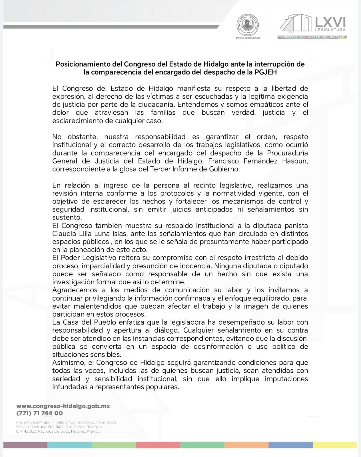 Posicionamiento del Congreso ante la interrupción de la comparecencia del despacho de la PGJEH