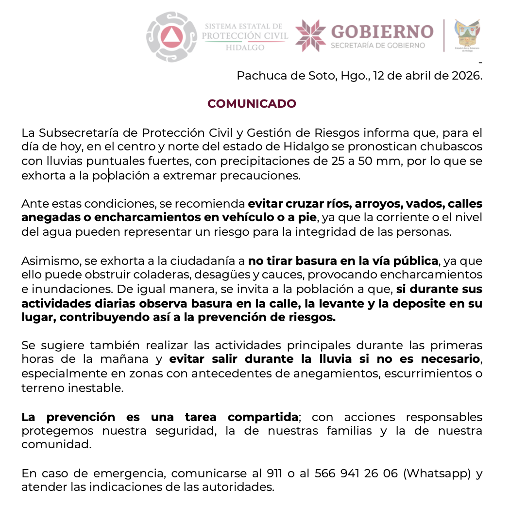 La Subsecretaría de Protección Civil y Gestión de Riesgos informa