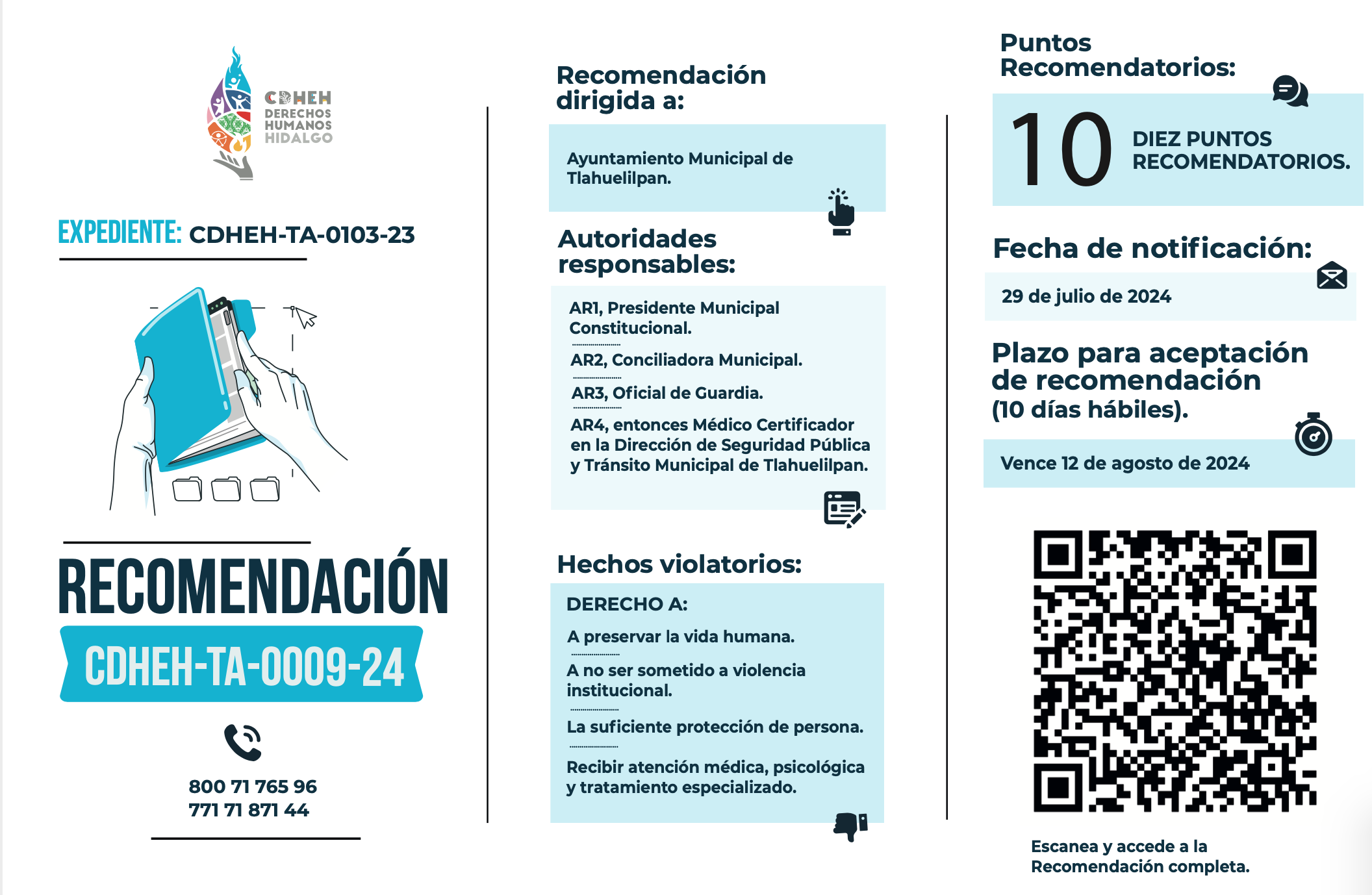 La segunda recomendación presentada fue la R-TA-0009-2,, que se desprende de los hechos que dieron origen a la queja de oficio correspondiente al 01 de mayo de 2023, luego de que a través de facebook se diera a conocer que un hombre se había quitado la vida cuando estaba detenido en el Área de Detención Municipal de Tlahuelilpan; queja a la cual, posteriormente, se adhirió la una de las víctimas indirectas.