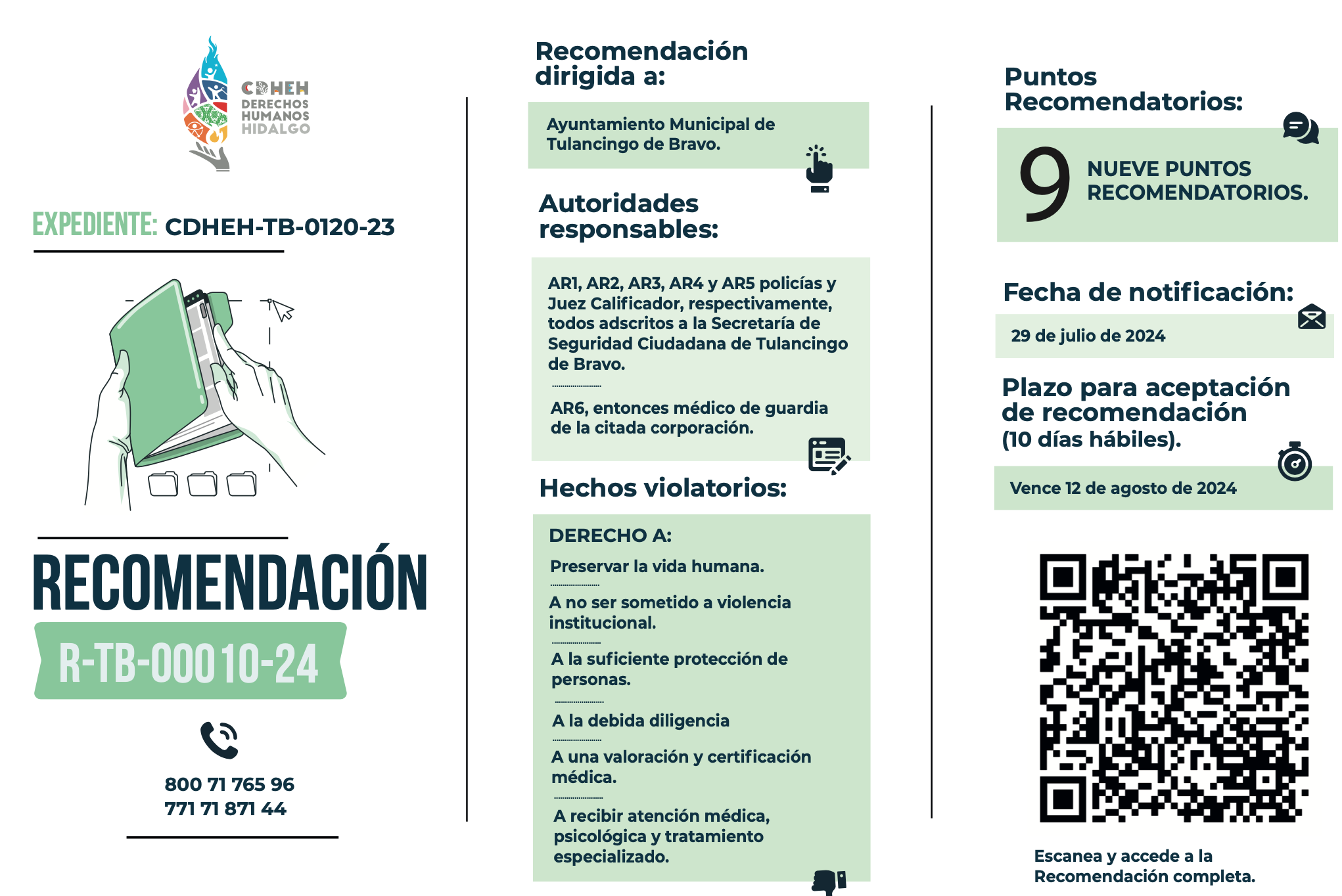 En tal virtud, el 29 de julio de 2024, se notificó a las víctimas y al Ayuntamiento Municipal de Tulancingo de Bravo, la Recomendación R-TB-0010-24, en la que se establecieron 9 puntos recomendatorios.