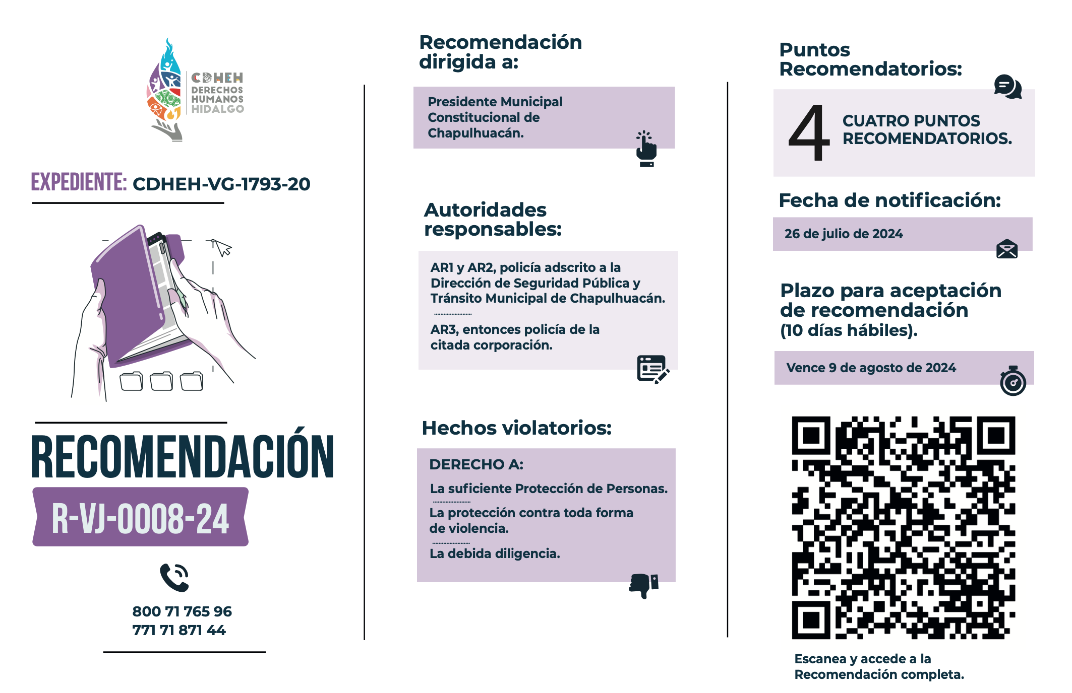 En tal virtud, el 26 de julio de 2024, se notificó al Presidente Municipal Constitucional de Chapulhuacán, la Recomendación R-VJ-0008-24, en la que se establecieron 4 puntos recomendatorios.