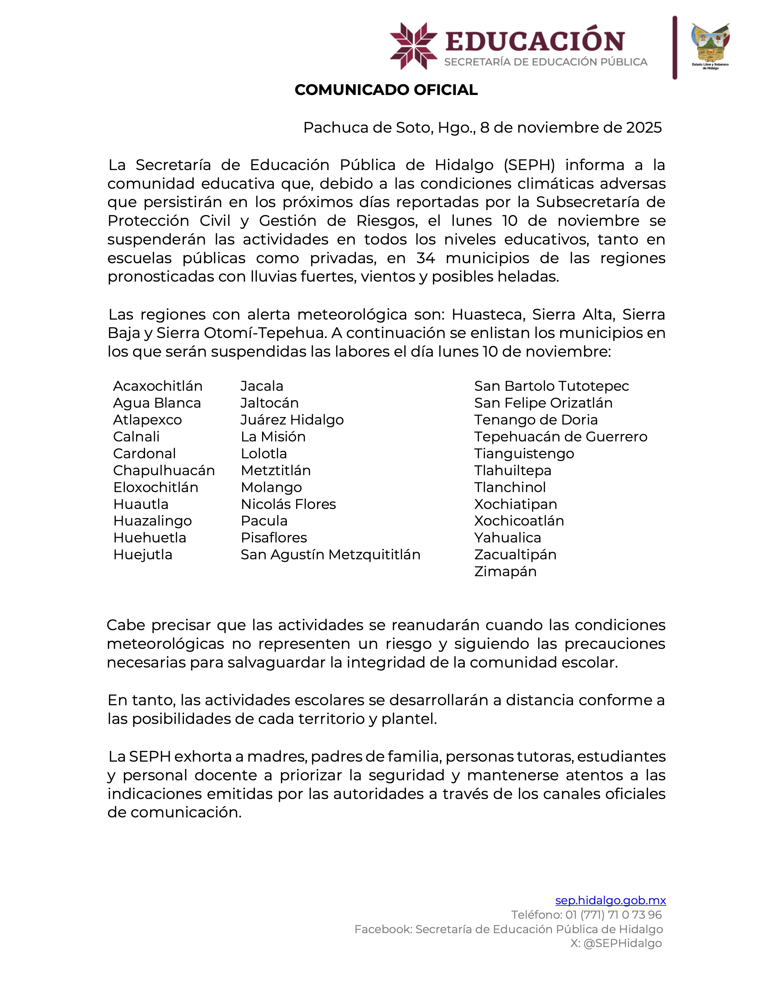 La Subsecretaría de Protección Civil y Gestión de Riesgos del estado de Hidalgo pide a la población tomar las medidas pertinentes con especial atención para los próximos días 9 y 10 de noviembre, en los que se prevén lluvias fuertes y descenso de temperatura en diversas regiones del estado