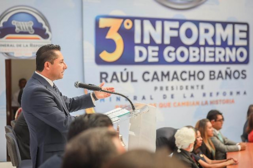 Rinde su 3er. Informe de Gobierno, el alcalde de Mineral de la Reforma, Raúl Camacho Baños; en sesión solemne de Ayuntamiento, llevada a cabo en el Teatro Chicomecóatl de Pachuquilla. Donde dio cuenta de un año más de trabajo, destacando los resultados alcanzados en concordancia al Plan de Desarrollo Municipal y la continuidad de las labores en cada uno de los ejes: Gobierno Honesto, Cercano y Moderno; Próspero y Dinámico; Humano e Igualitario; Seguro con Justicia y en Paz y con Desarrollo Sustentable.