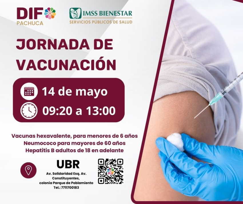 El Sistema DIF Municipal Pachuca invita a la población a acudir a la jornada de vacunación que se realizará este 14 de mayo en la Unidad Básica de Rehabilitación (UBR), ubicada en Av. Constituyentes, 1a. Sección Parque de Poblamiento, en un horario de 09:20 a 13:00 horas.