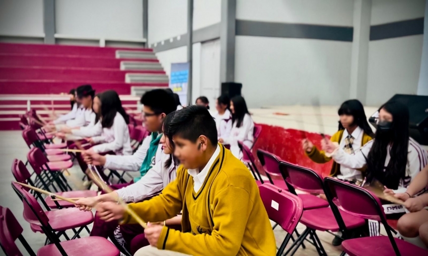 Durante la actividad, las y los estudiantes participaron en ejercicios de percusión con sillas y baquetas, prácticas de coordinación guiada y dinámicas rítmicas grupales basadas en la canción “Believer” de Imagine Dragons. Estas acciones permitieron integrar movimiento, escucha activa y trabajo en equipo en un ambiente participativo y energizado.