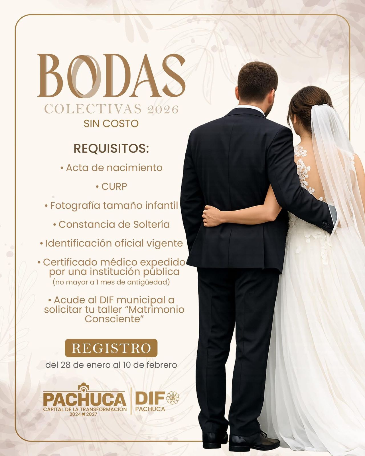 El Registro Familiar, en coordinación con el DIF Pachuca, recuerda que mañana 10 de febrero es el último día de registro para las parejas interesadas en participar en las Bodas Colectivas 2026, ceremonia que se realizará el jueves 12 de febrero.