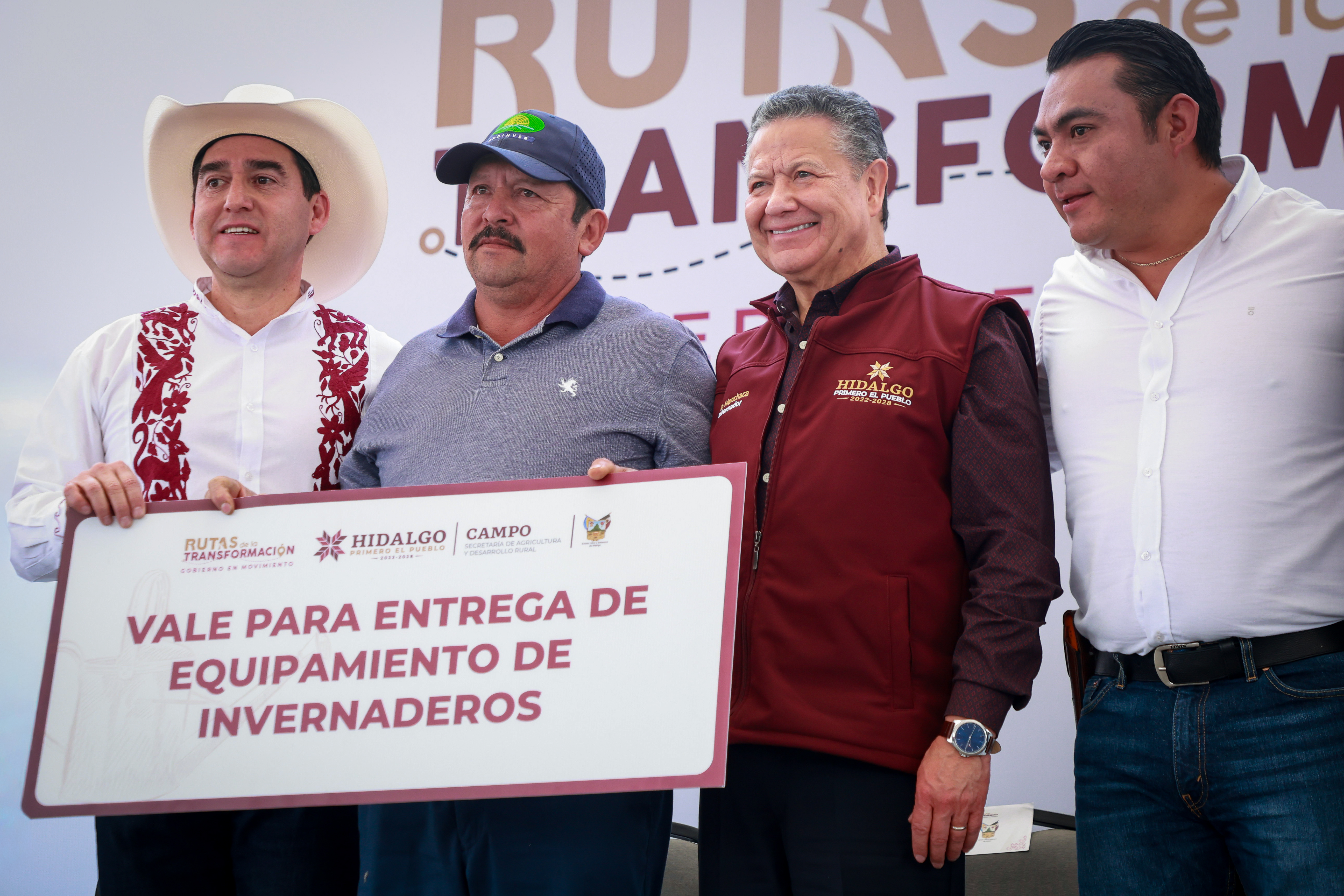 Para impulsar el campo hidalguense, el titular del Ejecutivo estatal encabezó la entrega regional a 438 personas productoras de los municipios de El Arenal y Pachuca, gracias a una inversión superior a los 2 millones 300 mil pesos. Entre los apoyos destacan invernaderos, semillas certificadas, aves de doble propósito y herramientas, detalló Napoleón González Pérez, secretario de Agricultura y Desarrollo Rural.