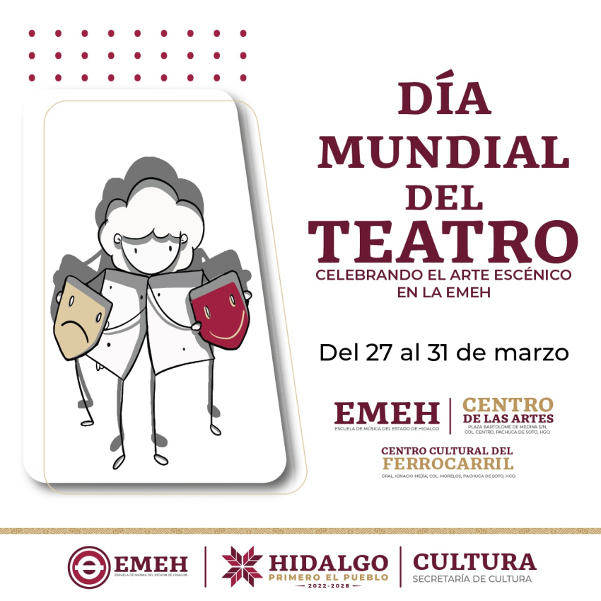 La Secretaría de Cultura, dirigida por Tania Eréndira Meza Escorza, a través de la Escuela de Música del Estado de Hidalgo (EMEH), conmemorará el Día Mundial del Teatro, del 27 al 31 de marzo, en las instalaciones de la institución, en el Centro Cultural del Ferrocarril y en el Centro de las Artes de Hidalgo.
