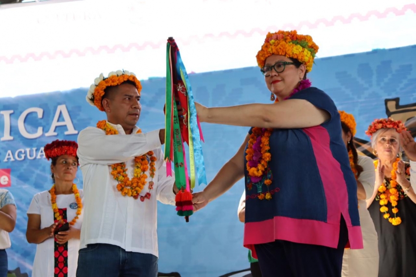 SAN FELIPE ORIZATLÁN / YAHUALICA. – Tania Meza Escorza, secretaria de Cultura en Hidalgo, entregó a Erika Saab Lara, presidenta municipal de San Felipe Orizatlán, el Bastón de Mando para dar inicio con las actividades del XXVI Festival de la Huasteca en la plaza principal del “lugar de arroz”.