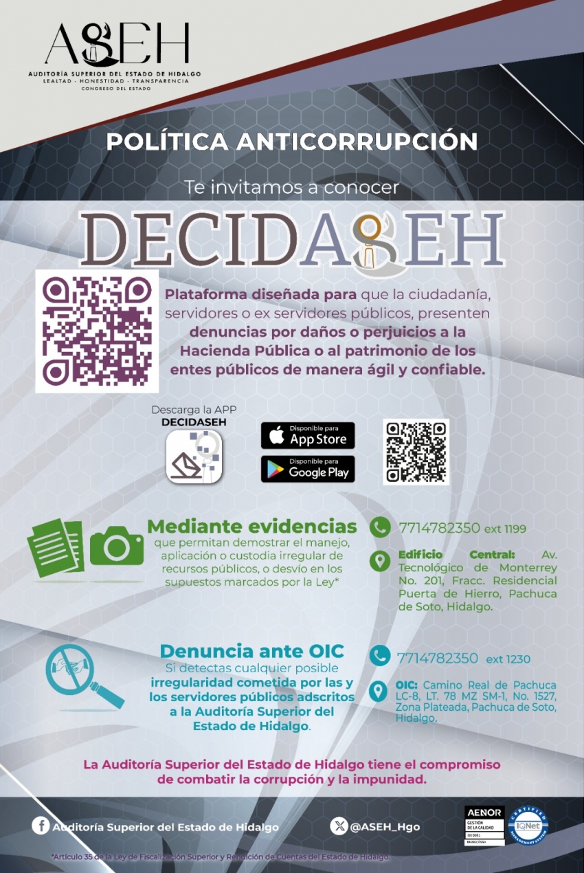 El Auditor Superior reiteró que en caso de que se detecte cualquier posible irregularidad cometida por las y los servidores públicos adscritos a la ASEH, se puede presentar la de denuncia correspondiente a través del Órgano Interno de Control a través del teléfono 7714782350 ext 1230 o de manera presencial en las oficinas del OIC, ubicadas en Camino Real de Pachuca LC-8, LT. 78 MZ SM-1, No. 1527, Zona Plateada, Pachuca de Soto, Hidalgo.