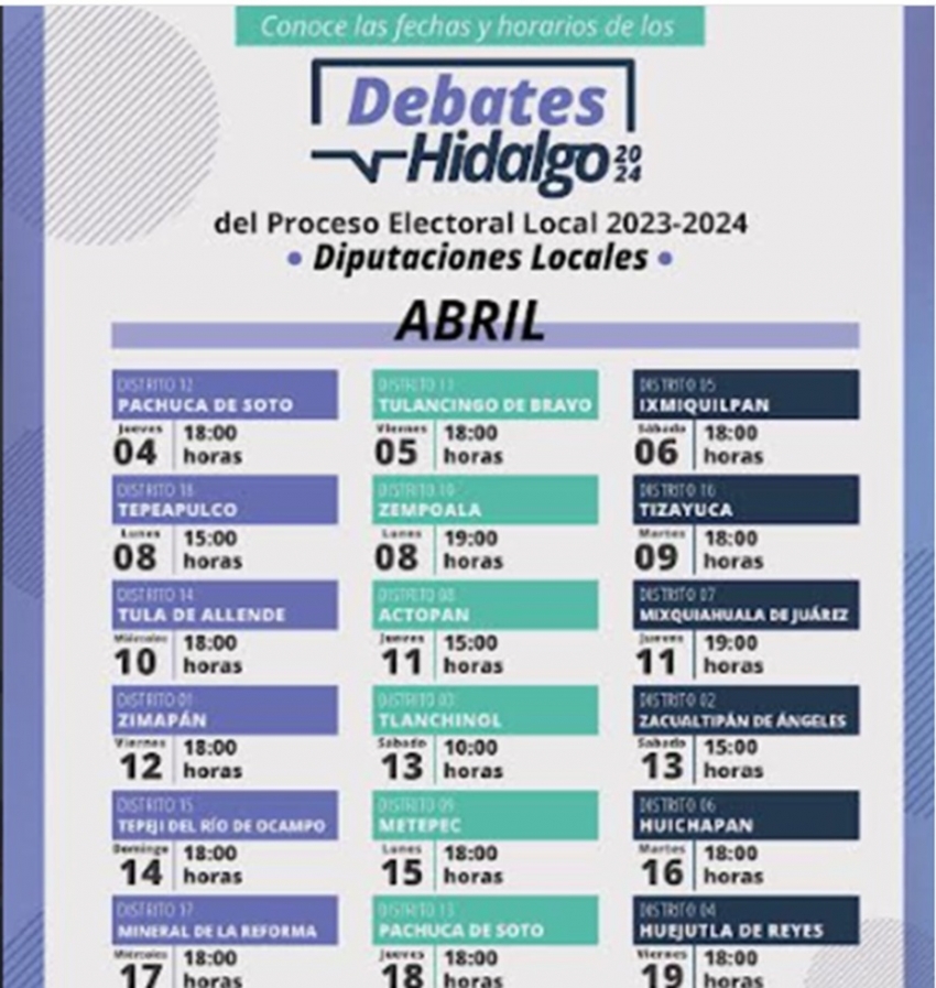 El primero de los debates será entre los aspirantes del distrito 12 de Pachuca, y se llevará a cabo a las 6 de la tarde en el Instituto Tecnológico de Pachuca, que fue la sede aprobada para este primer encuentro.