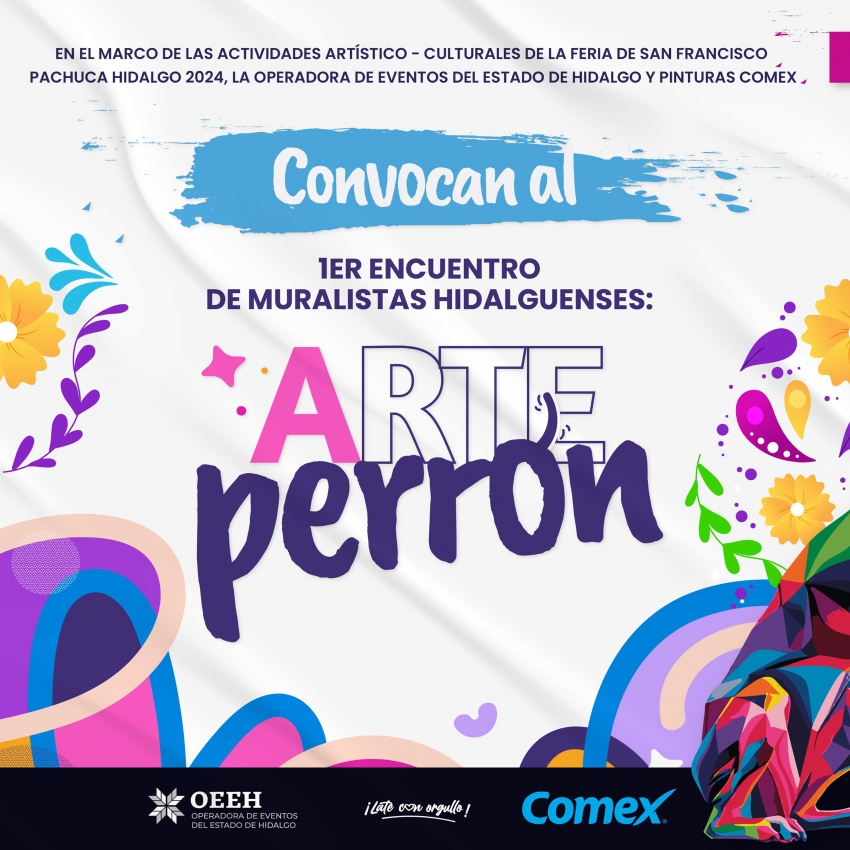 La Operadora de Eventos del Estado de Hidalgo (OEEH), en colaboración con Pinturas Comex, convoca a participar en el Primer Encuentro de Muralistas Hidalguenses denominado “Arte Perrón”, proyecto que forma parte de las actividades artístico-culturales de la próxima Feria de San Francisco Pachuca Hidalgo 2024.