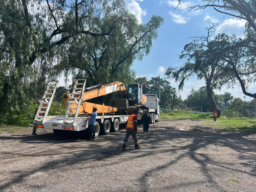 La excavadora de brazo largo de la Marina atiende el tramo en San Marcos, mientras que, de manera coordinada, la SIPDUS interviene aguas abajo de la confluencia del río Tlautla, a la altura de Ciudad Cooperativa Cruz Azul.