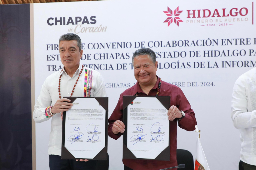 En un acto de fraternidad, el gobernador de Hidalgo, Julio Menchaca Salazar, y su homólogo de Chiapas, Rutilio Escandón Cadenas, signaron el Convenio de Colaboración para la Transferencia de Tecnologías de la Información.