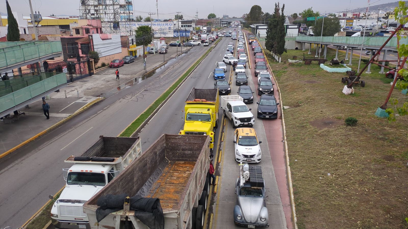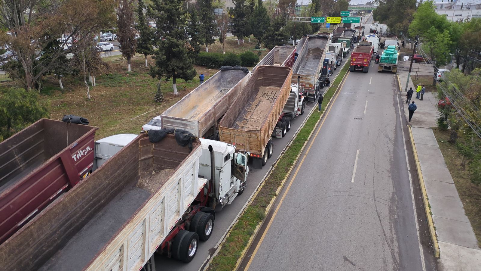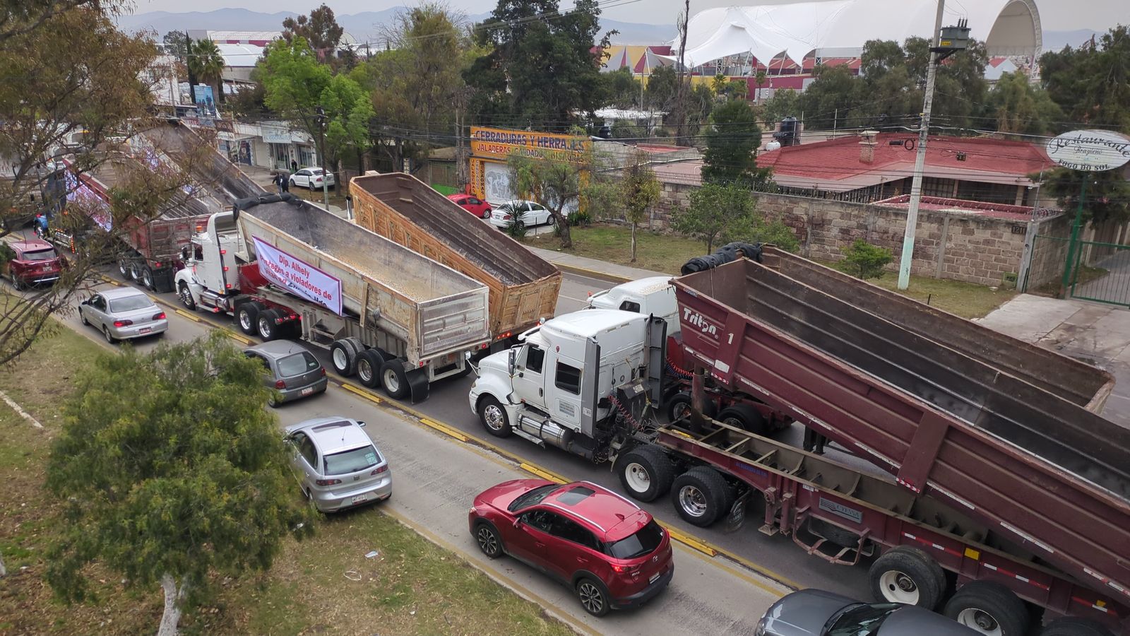 Pachuca,Hgo.,- Decenas de camiones materialistas y miembros del Sindicato de Trabajadores de la Industria del Cemento, bloquean, desde esta mañana, la Plaza Juárez así como las principales calles, avenidas y bulevares de la capital hidalguense.