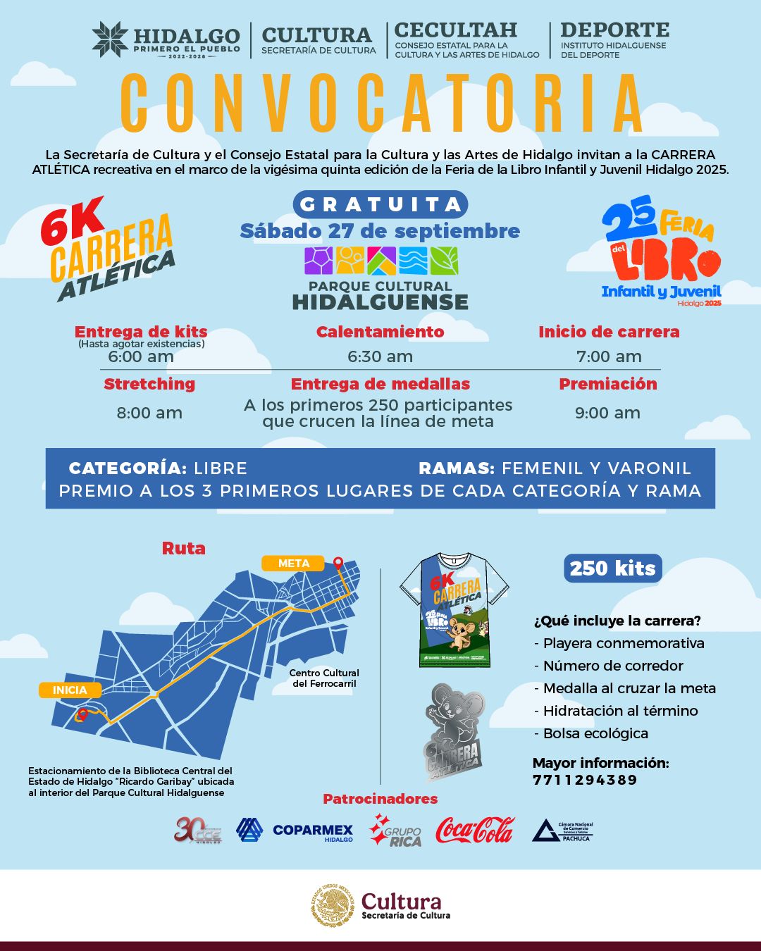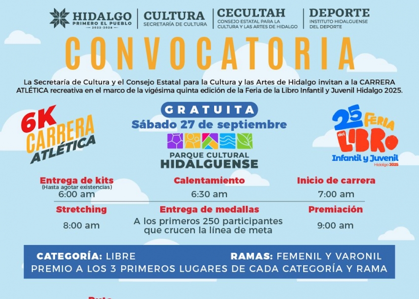 La Secretaría de Cultura de la entidad, el Consejo Estatal para la Cultura y las Artes de Hidalgo (Cecultah) y el Instituto Hidalguense del Deporte invitan a la población en general participar en la Carrera Atlética de seis kilómetros, actividad recreativa enmarcada en la vigésima quinta edición de la Feria del Libro Infantil y Juvenil de Hidalgo 2025.