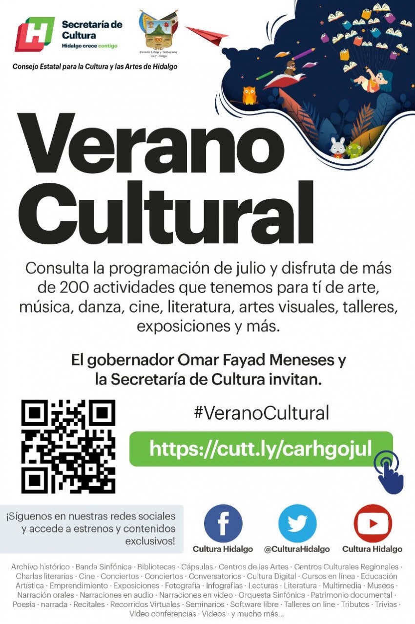 “La cultura se compone de nuestras costumbres, nuestros códigos, normas, tradiciones, y las distintas expresiones artísticas, todo en conjunto representa para el ser humano algo vital para poder generar identidad y arraigo, es por ello que dentro de la oferta de esta estrategia impulsada por el Gobierno de Hidalgo a través de la Secretaría de Cultura, tenemos más de 200 actividades de música, danza, cine, arte, literatura, artes visuales, talleres, exposiciones y más”, apunto.