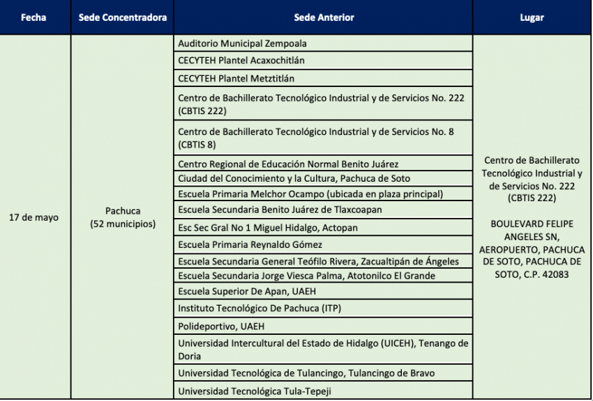 El Gobierno del Estado, a través de la Secretaría de Educación Pública de Hidalgo (SEPH), informa que se abrirán tres sedes para que el personal educativo que se registró en la plataforma para recibir su vacuna, pero que no pudo acudir a su cita en la fecha y horario que le correspondía, aún pueda hacerlo.