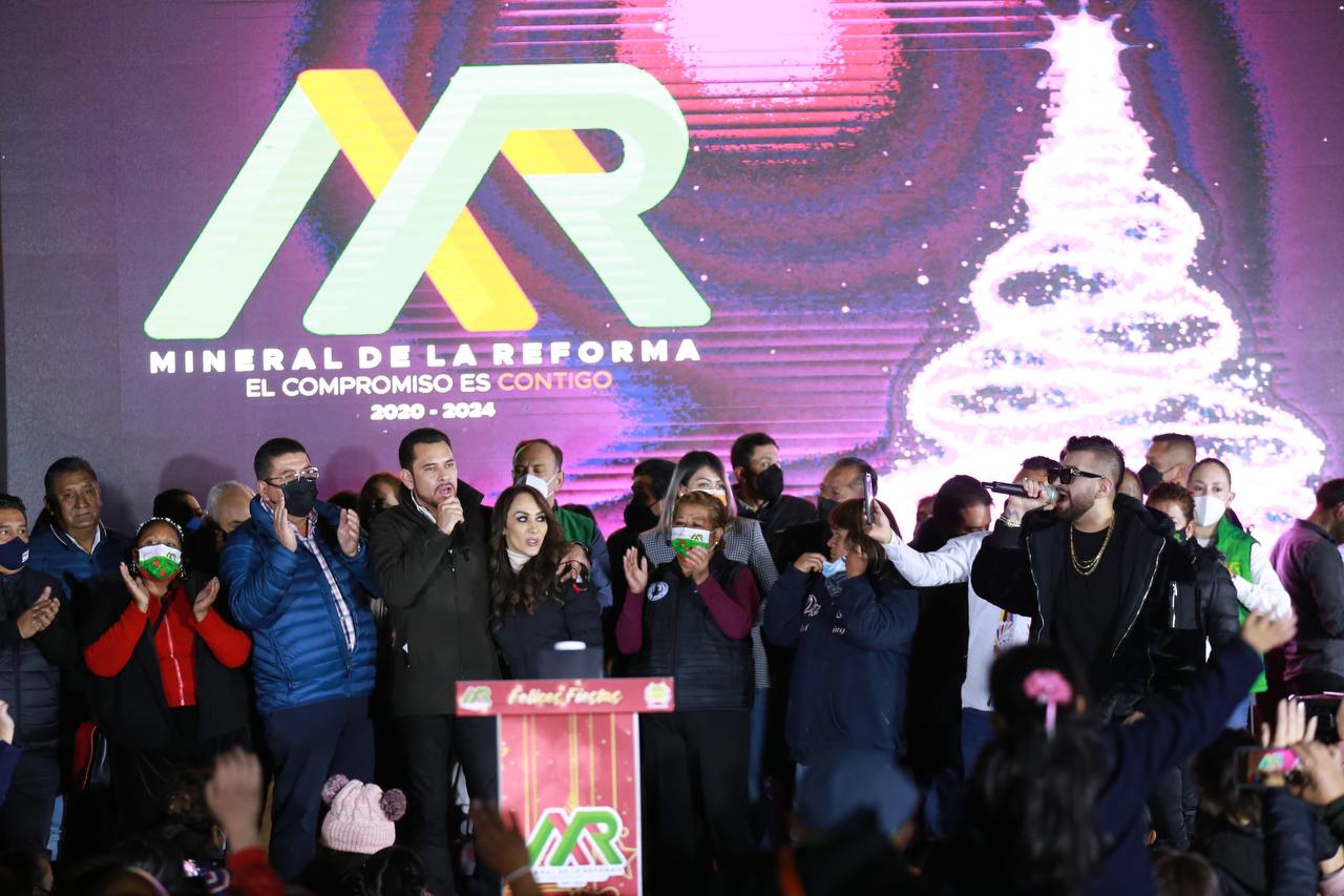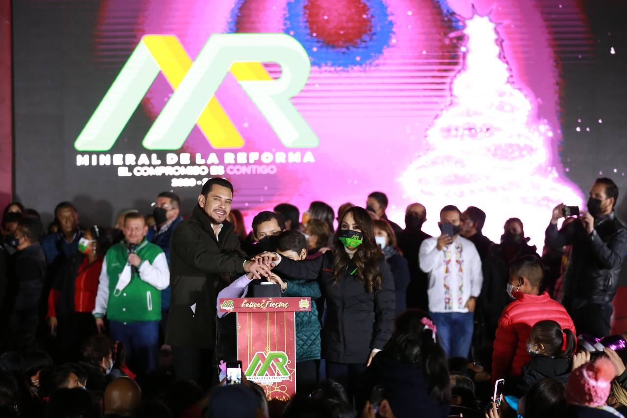 Entre música y el conteo regresivo a una sola voz, Israel Felix y Shadia Martínez junto con familias mineral reformenses dieron inicio de la temporada navideña con el encendido del pino.