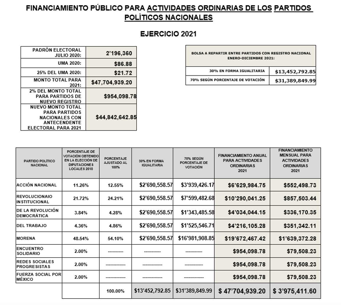 En otro orden de ideas y durante la misma sesión, fue aprobado el financiamiento público y el límite del financiamiento privado que recibirán los Partidos Políticos para el sostenimiento de actividades ordinarias permanentes y actividades específicas para el ejercicio 2021, los cuales quedan de la siguiente manera: