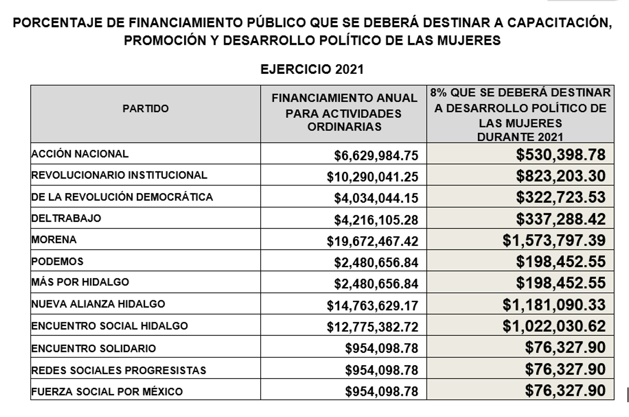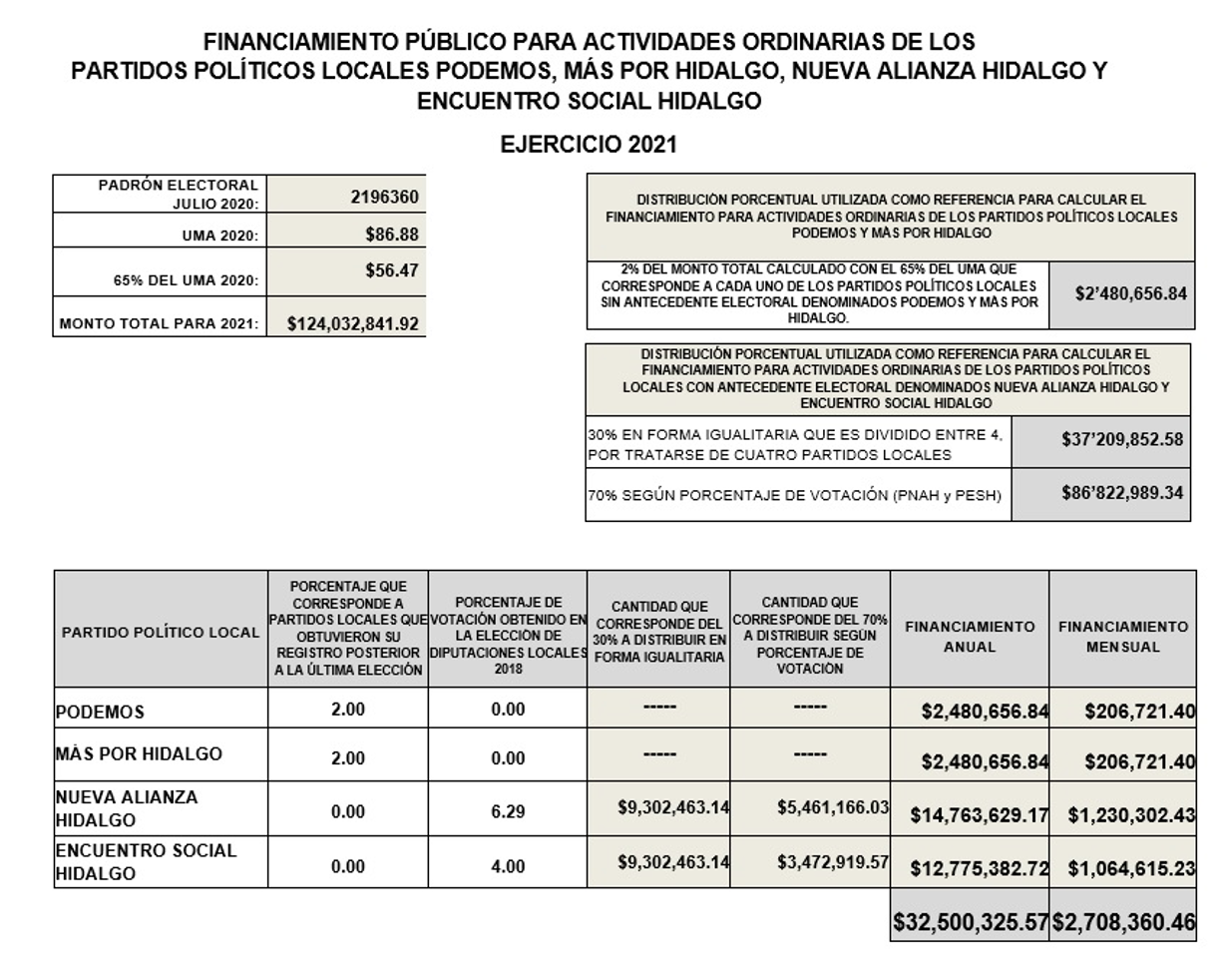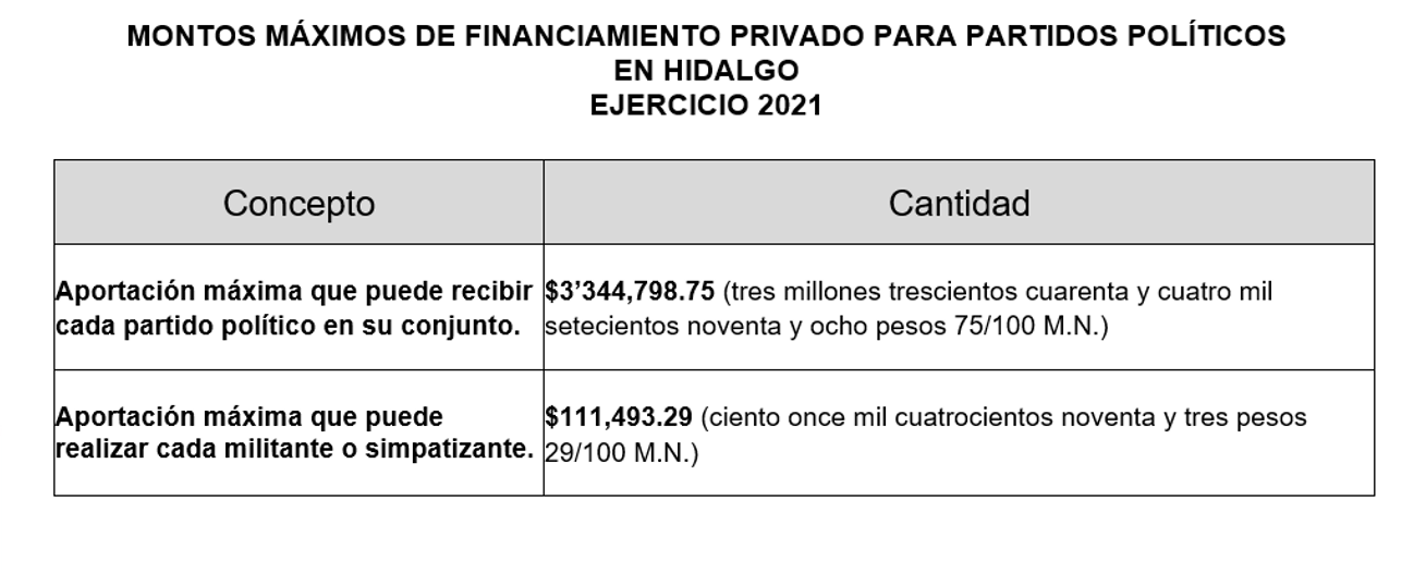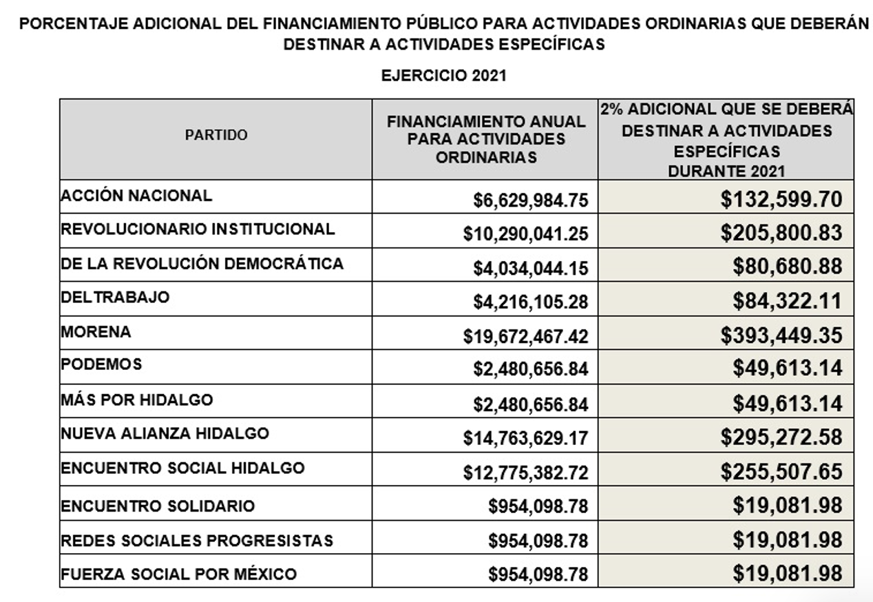 De la misma manera, se determinó otorgar Financiamiento Público al Partido Más Por Hidalgo para el sostenimiento de sus actividades ordinarias permanentes y actividades específicas para el ejercicio 2021. Y en cuanto a los partidos Verde Ecologista de México (PVEM) y Movimiento Ciudadano (MC), por no haber obtenido el 3% de la votación en la elección anterior, no les corresponde financiamiento público, sin embargo, respecto al financiamiento privado no existe disposición que prohíba a dichos partidos recibirla.