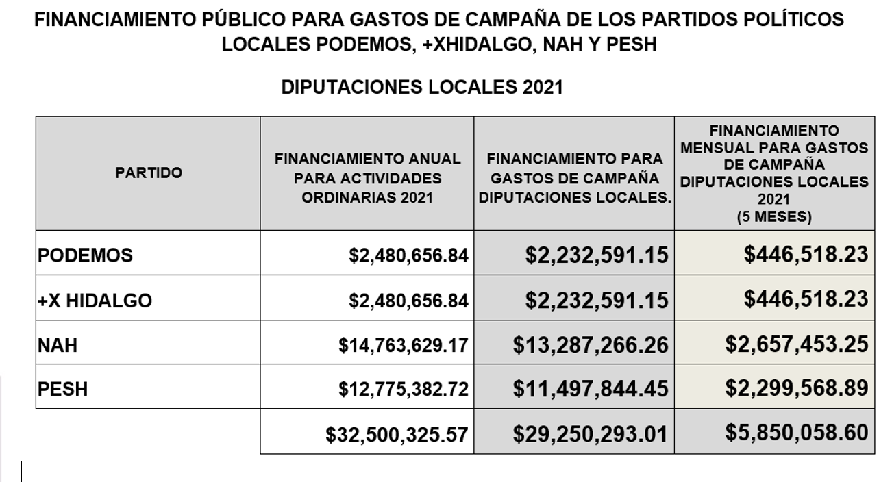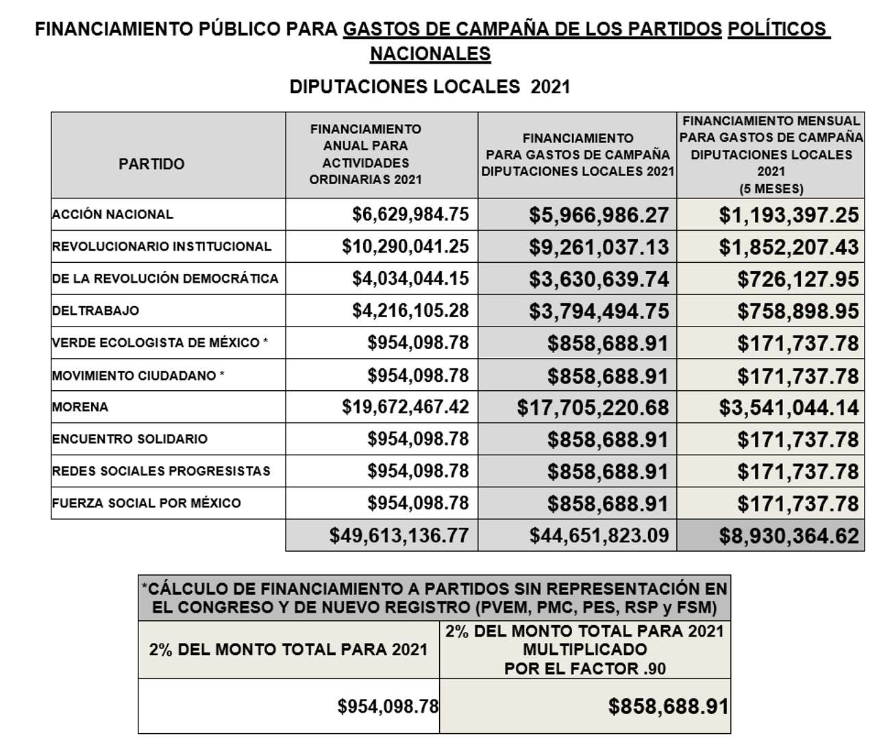 De igual manera fue aprobado el acuerdo relativo al financiamiento público para gastos de campaña de los Partidos Políticos para el Proceso Electoral Local 2020-2021, quedando de la siguiente manera: