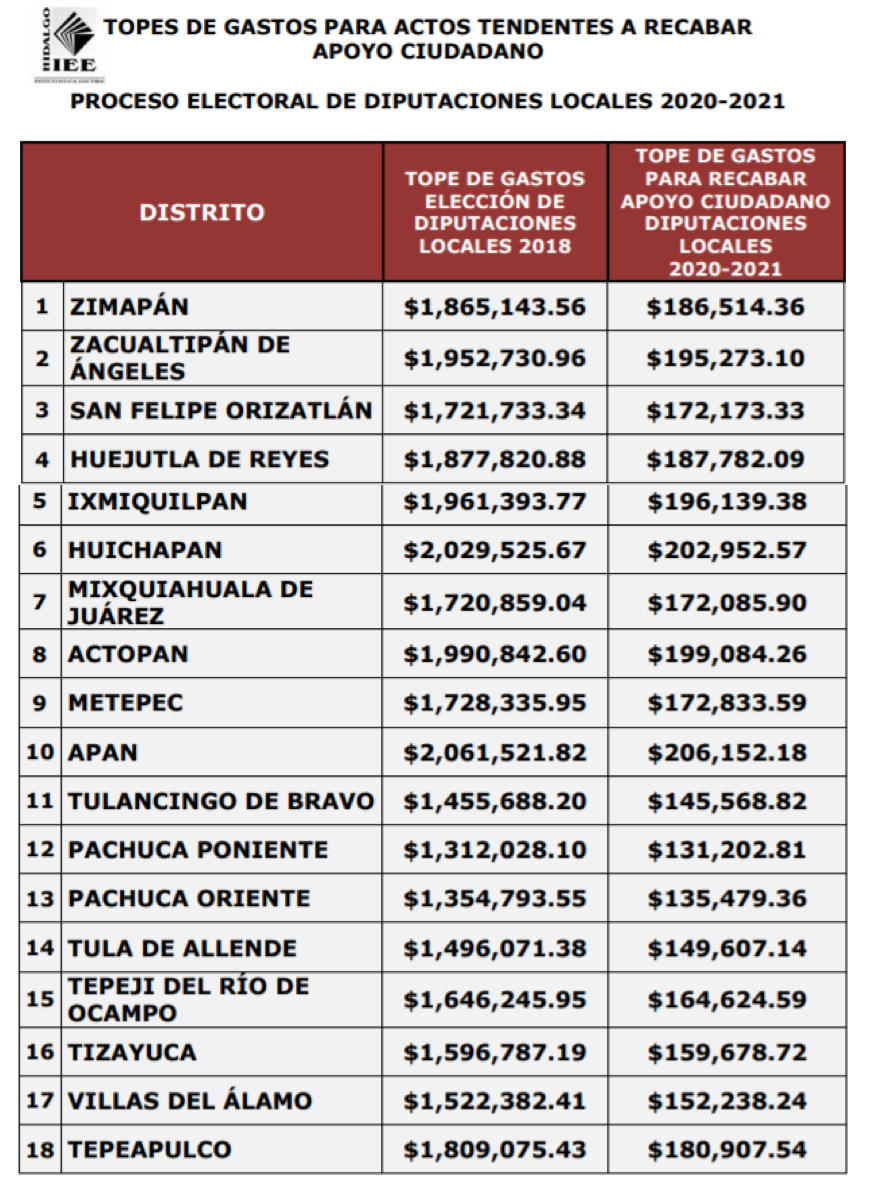 De la misma manera, se aprobó el acuerdo relativo a la aprobación de los topes de gastos para actos tendentes a recabar apoyo ciudadano de las y los aspirantes a candidatura independiente en el Proceso Electoral Local 2020-2021, para la renovación del Congreso Local, tope que quedó establecido de la siguiente manera: