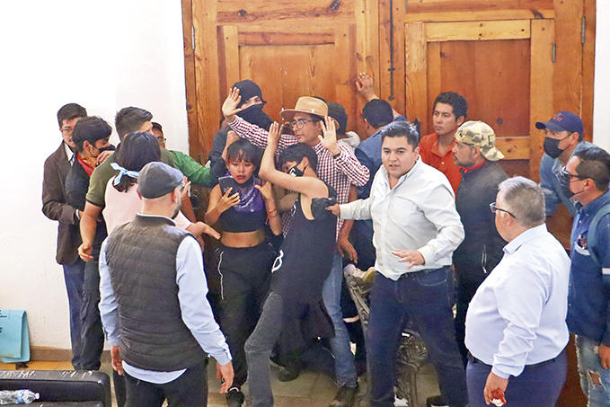 Una vez que se impidió el acceso al grupo de universitarios, la manifestación se radicalizó y prácticamente reventaron el portón de madera para internarse en el edificio universitario.