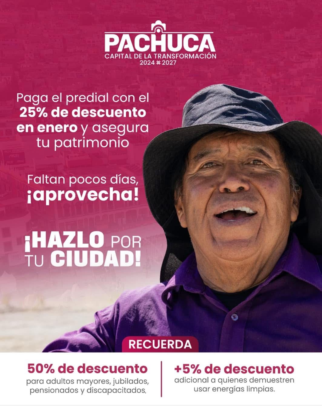 Las y los ciudadanos de la Capital de la Transformación aún pueden aprovechar el 25% de descuento en enero para el pago del impuesto predial 2025.