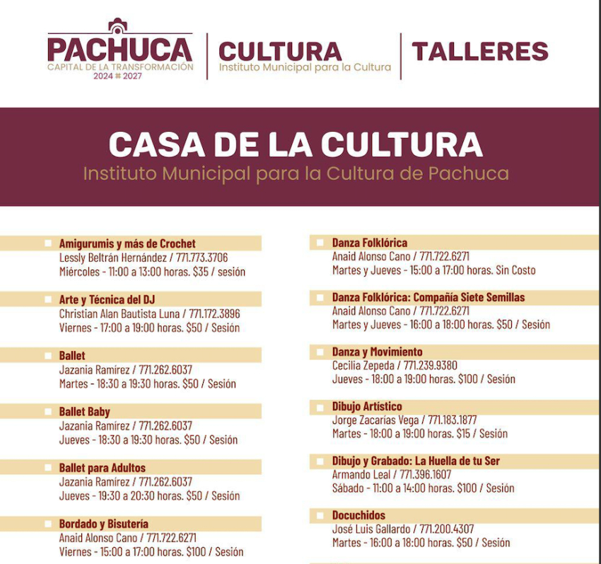 El Instituto Municipal para la Cultura de Pachuca, que dirige Ángel Aguillón López, anunció la implementación de 38 talleres itinerantes con el objetivo de fortalecer el tejido social a través del desarrollo cultural, enfocado en la creación y difusión artística.