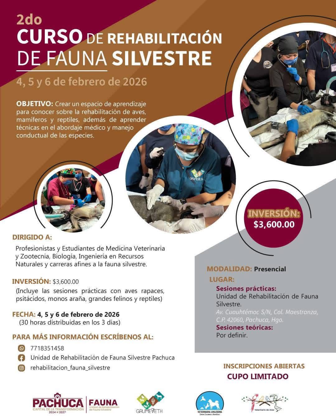 Las actividades prácticas se desarrollarán en la Unidad de Rehabilitación de Fauna Silvestre, ubicada en avenida Cuauhtémoc s/n, colonia Maestranza, código postal 42060, en Pachuca, Hidalgo. El curso cuenta con inscripciones abiertas y cupo limitado.
